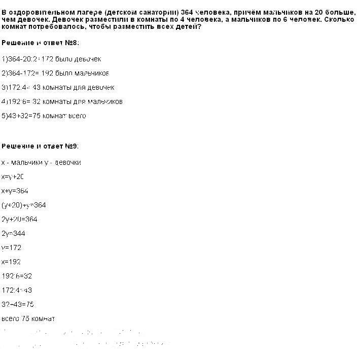 В оздоровительном лагере 364 человека.Мальчиков на 20 больше, чем девочек. Девочек разместили в комнаты по 4 человека, а мальчиков-по 6человек.Сколько комнат потребовалось, чтобы разместить всех детей