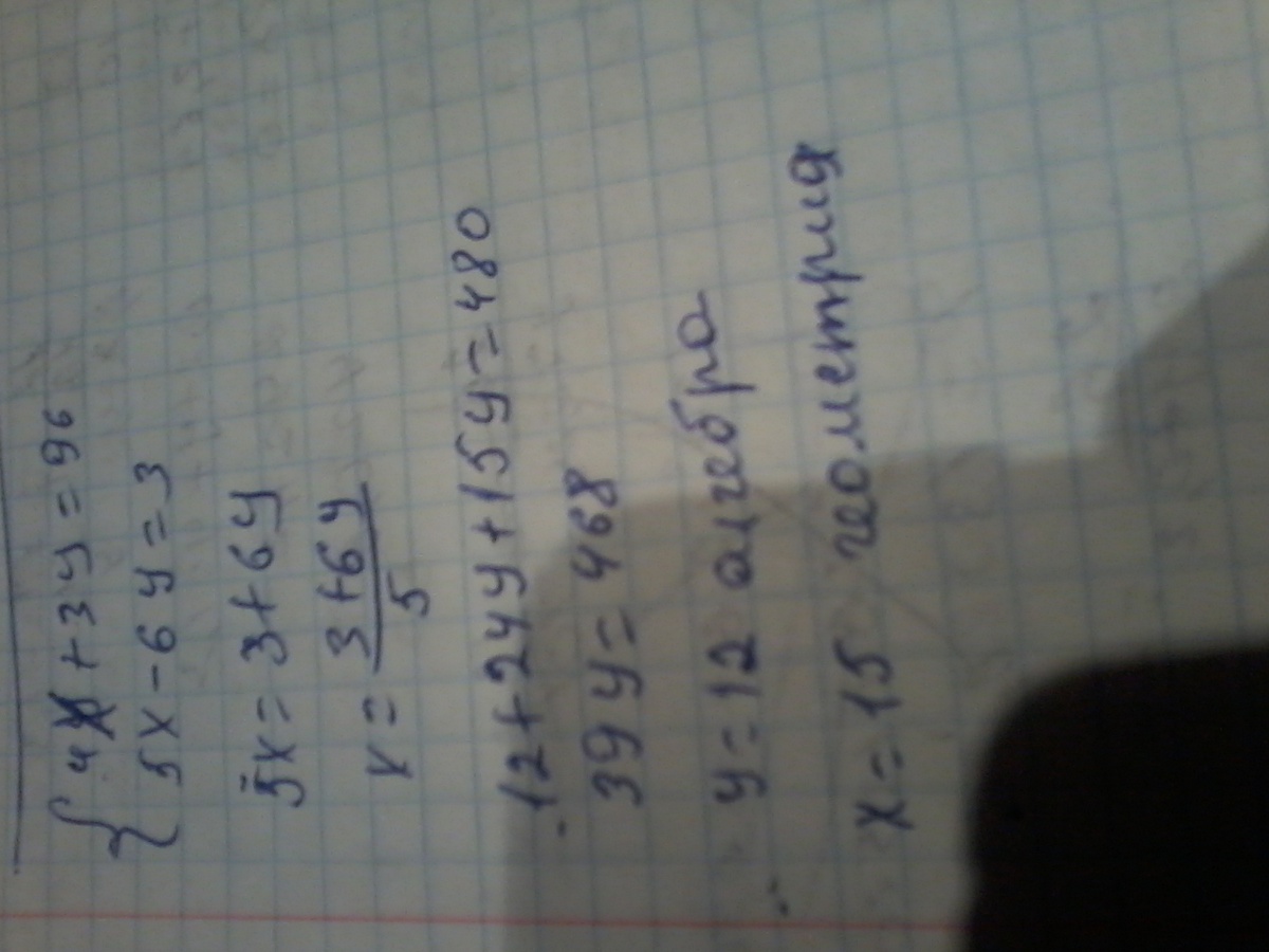 В один день в школьную библиотеку привезли 4 пачки учебников по геометрии и 3 пачки учебников по алгебре, всего 96 книг. В другой день- 5 пачек учебников по геометрии и 6 пачек учебников по алгебре, причём учебников по геометрии на 3 больше, чем по алгебре. Сколько учебников в каждой пачке?