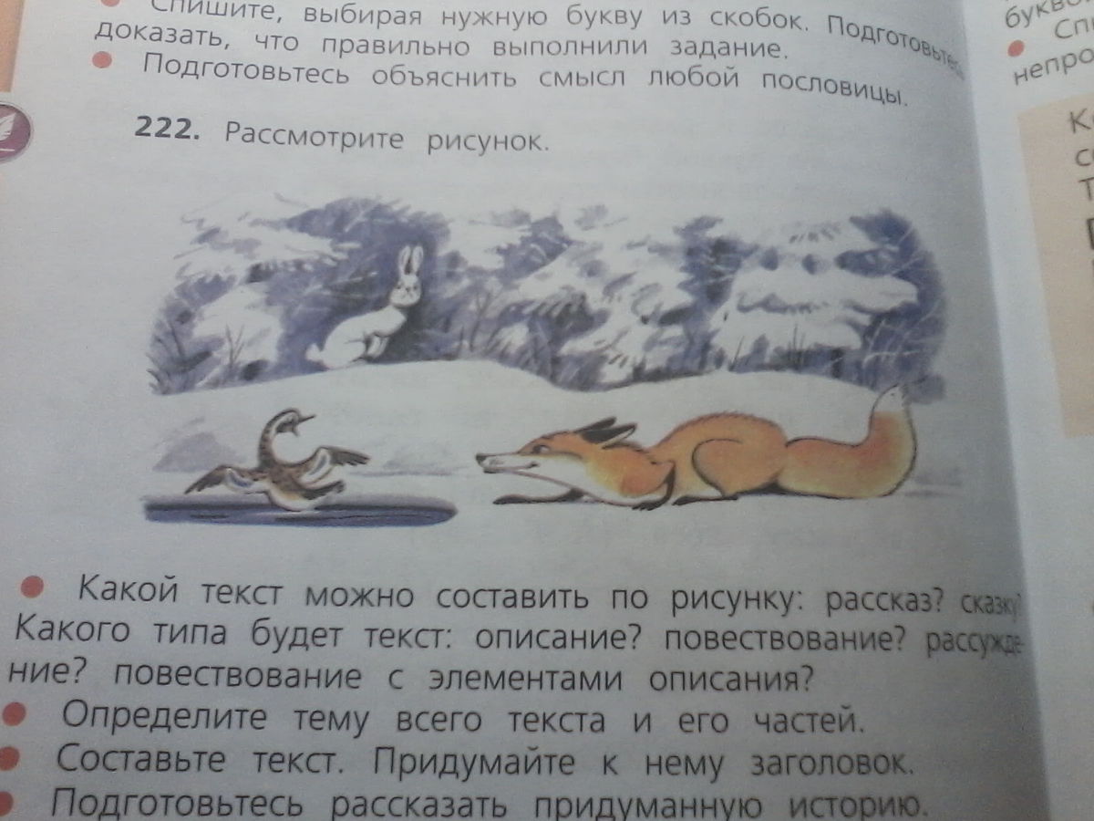 какой текст можно составить по рисунку: рассказ? сказку? какого типа будет текст: описание? повествование? рассуждение? повествование с элементами описания?