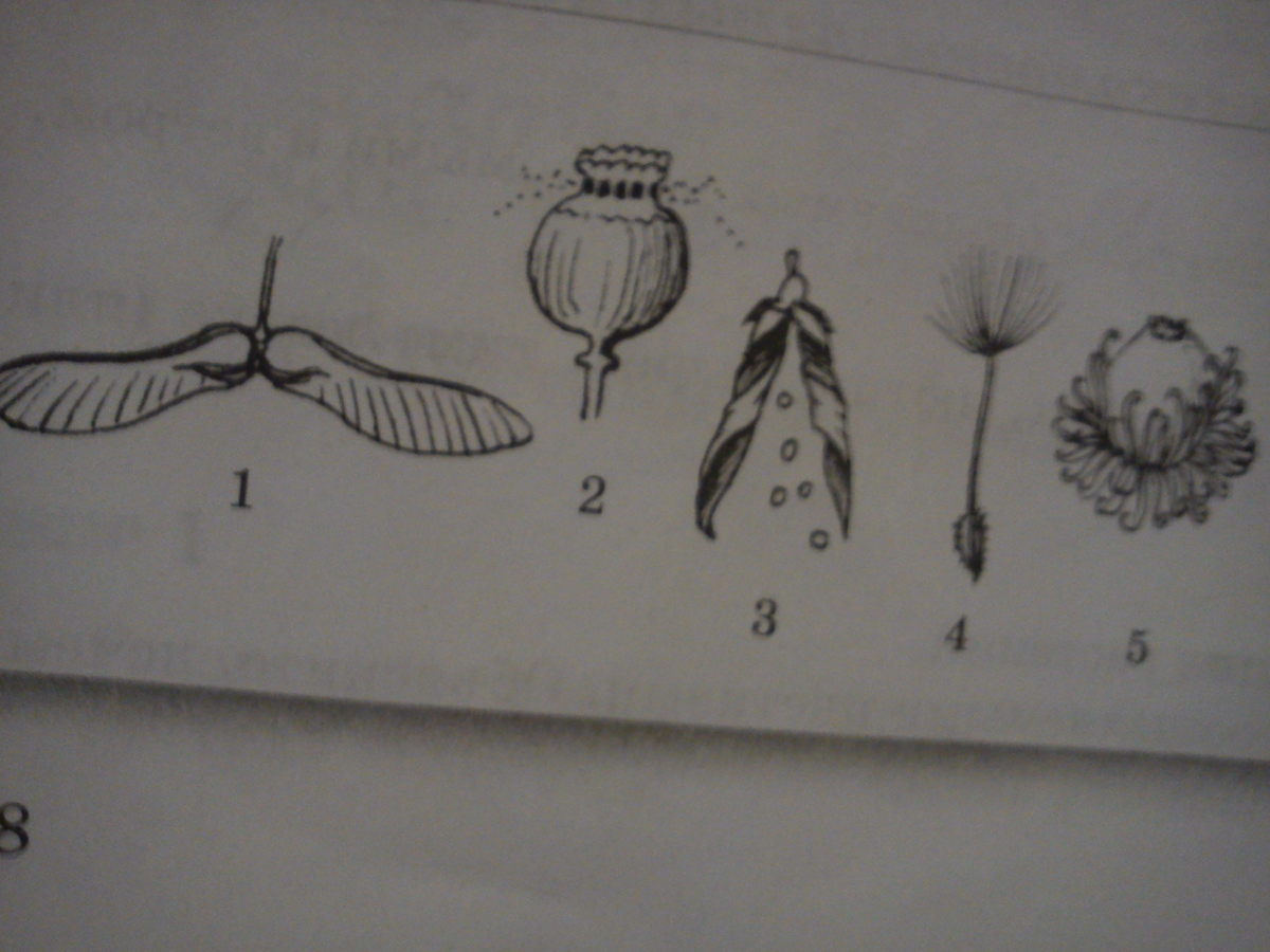 Распространение ветром имеют специальные приспособления-летучки, рисунки 1-клен, 2-мак, 4-одуванчик;