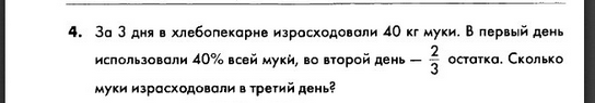 за 3 дня в хлебопекарне израсходовали 40 кг муки. В первый день использовали 40% всей муки, во второй день - 2/3 остатка . Сколько муки израсходовали в третий день?
