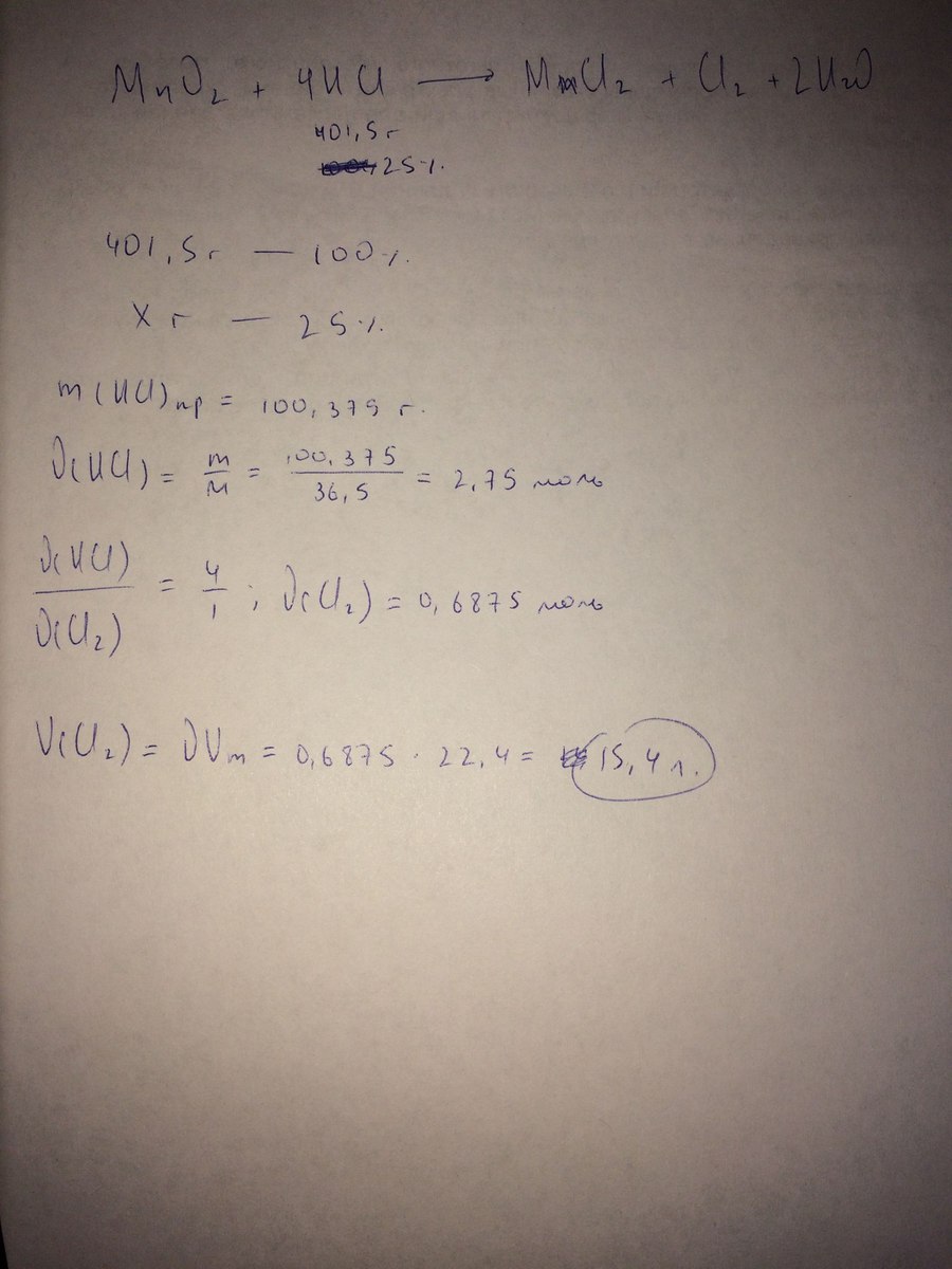 Определите объём хлора(н.у), который выделится при взаимодействии 401,50 г 25 процентной соляной кислоты с оксидом марганца(4)
