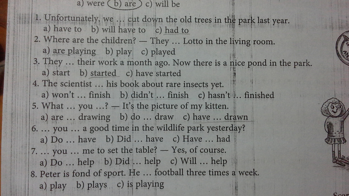Всё подчёркнуто в учебнике, только в 4м hasn't finished, в 5м скорее всего are you drawing, 6b, 7c, 8b