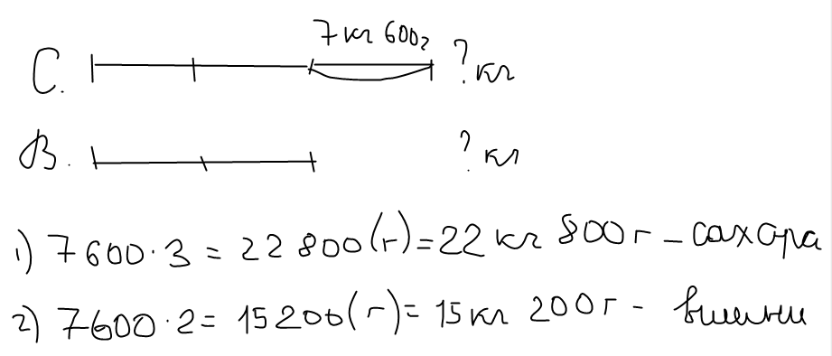 для приготовления вишневого варенья на 2 части вишни берут 3 части сахара (по массе). Сколько вишни и сколько сахара пошло на варенье, если сахара пошло на 7 кг 600г больше, чем вишни?