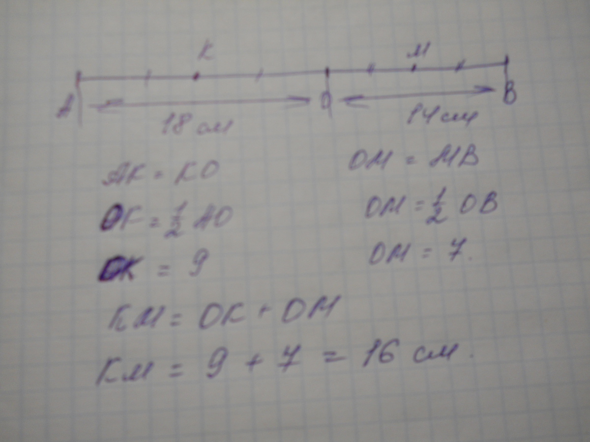 Найти длину отрезка КМ, если точка О делит отрезок АВ на два отрезка длиной 18 и 14 см, а точки К и М середина отрезка АО и ОВ