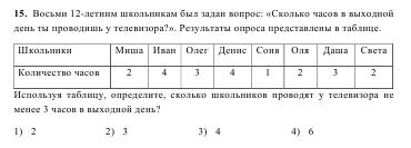 1). Не менее трех часов в день, т.е. 3 часа и более проводят у телевизора 4 школьника. Ответ: номер 3.