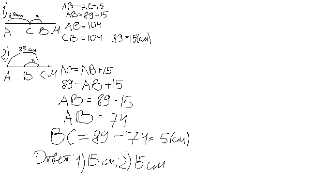 На луче АМ отложили отрезки АВ и АС, АС = 89 см.Найдите длину отрезка ВС, если: !)АВ на 15 см длинее АС; 2)АВ на 15 см короче АС.