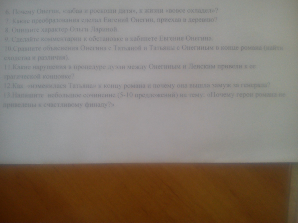 В деревне Евгений вёл здоровый образ жизни: вставал утром, а не в полдень, как в городе, переплывал речку, катался верхом, читал, занимался ведением хозяйства в имении: думая о трудном положении крестьян, заменил барщину лёгким оброком. И к женщинам он стал относиться иначе: он не воспользовался неопытностью Татьяны. По-другому Евгений смотрит на отношения между людьми: убив на дуэли Ленского, он понял цену человеческой жизни. Его терзали угрызения совести, и он не находил себе места ни в деревне, ни в дальних странствиях. Одним словом, в деревне Онегин повзрослел умом и душою.