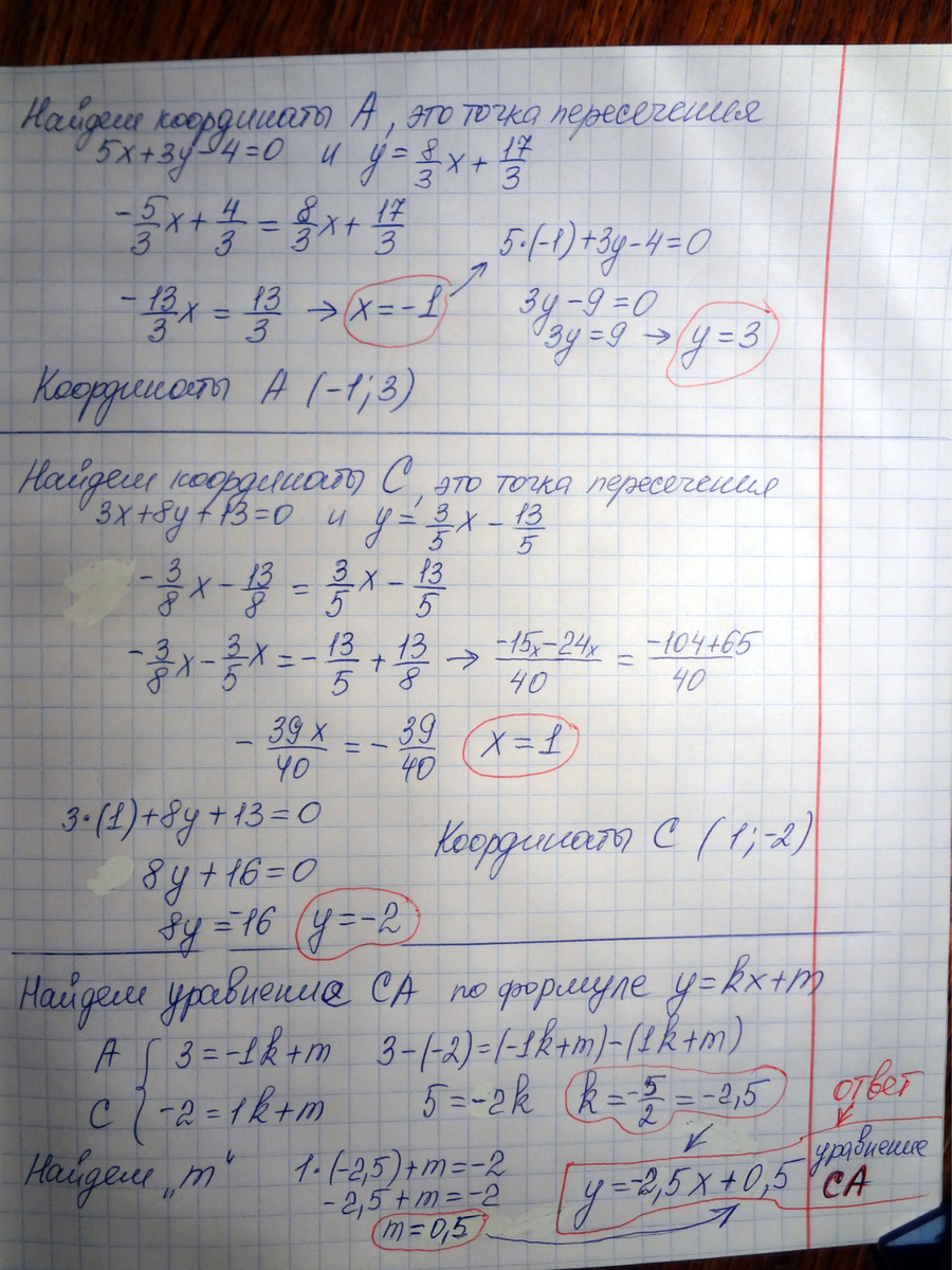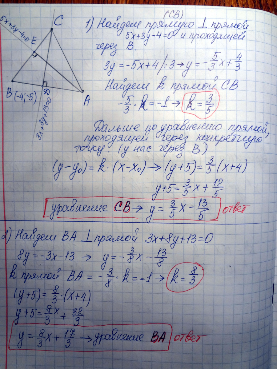 Составить уравнения сторон треугольника, если даны одна из его вершин В(-4,-5) и уравнения его высот (АЕ) 5x+3y-4=0 и (CD) 3x+8y+13=0