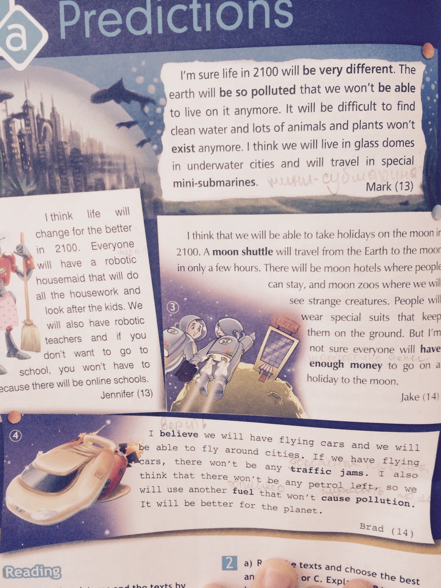 Я уверен, что жизнь в 2100 году будет сильно отличаться. Земля будет так загрязнена, что мы не будем способны больше здесь жить. Будет трудно найти чистую воду, многие животные и растения не будут существовать. Я думаю, что мы будем жить в стеклянных домах(куполах) под водой и будем путешествовать в специальных мини-подводных лодках. (Марк, 13 лет)