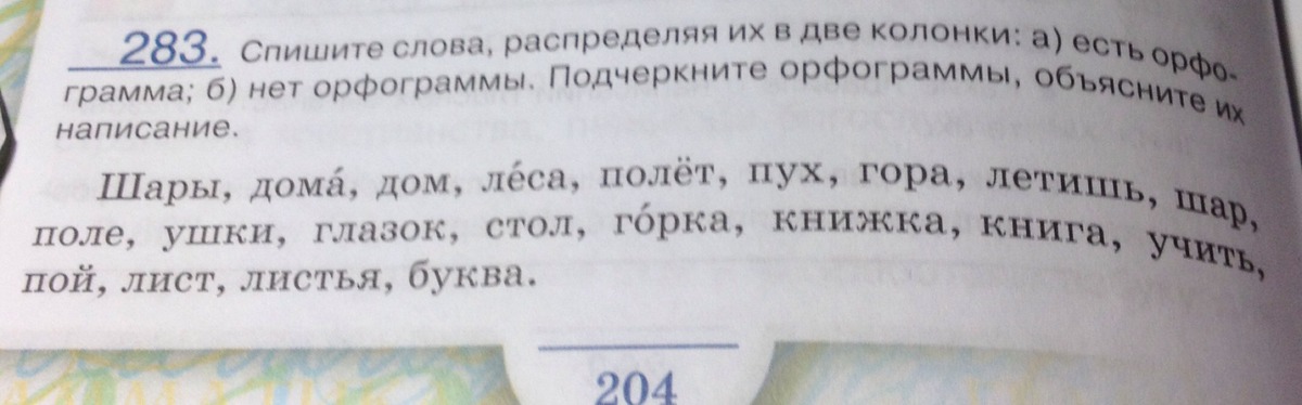Есть орфограммы : шары , дома , леса , полёт , гора , ушки . глазок , книжка , учить , листья . Нету : дом . пух , шар . поле . стол . горка . книга , пой , лист , буква .
