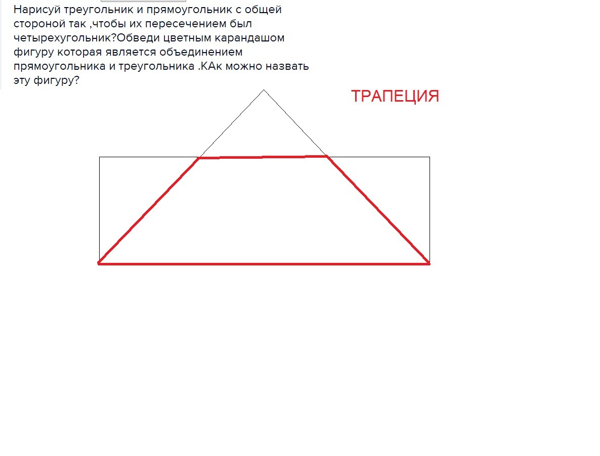 Нарисуй треугольник и прямоугольник с общей стороной так ,чтобы их пересечением был четырехугольник?Обведи цветным карандашом фигуру которая является объединением прямоугольника и треугольника .КАк можно назвать эту фигуру?