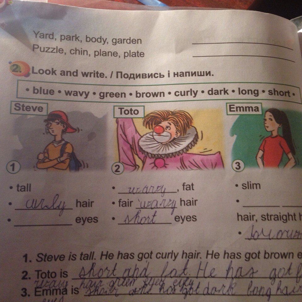 Алла Несвит. Рабочая тетрадь. 2 класс. с. 34, упражнение 3. Посмотри и дай ответы на вопросы. Пример: 1)Is Steve tall? - Yes, he is. He is tall. 2) Has Toto got long hair? - 3) Is Emma short and fat? - 4) Has Toto got blue eyes? - 5) Is Toto plump? - 6) Has Steve got wavy hair? - Помогите, кто нибудь!!!