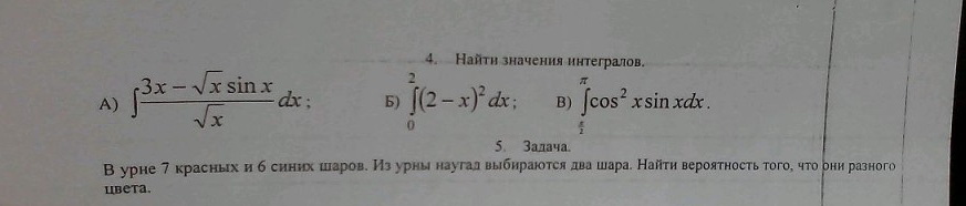 A) Преобразуем подынтегральное выражение: (1/√x(−√x*sin(x)+3x)=3√x−sin(x)Интегрируем почленно:Интеграл от произведения функции на константу есть эта константа на интеграл от данной функции:∫3x√dx=3∫√xdxИнтеграл x^n есть x^(n+1)/(n+1): ∫√xdx=2x^(3/2)/3Таким образом, результат будет: 2x^(3/2)Интеграл от произведения функции на константу есть эта константа на интеграл от данной функции:∫−sin(x)dx=−∫sin(x)dxИнтеграл от синуса есть минус косинус:∫sin(x)dx=−cos(x)Таким образом, результат будет: cos(x)Результат есть: 2x^(3/2)+cos(x)Добавляем постоянную интегрирования:2x^(3/2)+cos(x)+constantОтвет:2x^(3/2)+cos(x)+constant