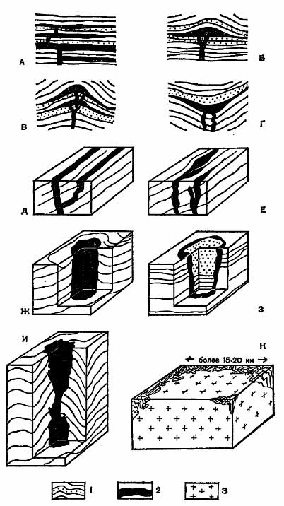 И — шток, К — батолит1 — вмещающие породы (сланцы и песчаники) 2 — интрузивные породы, 3 — гранитоиды