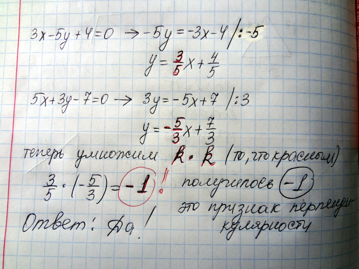 Перпендикулярны ли прямые: 3х-5у+4=0 и 5х+3у-7=0 . Решите!!!