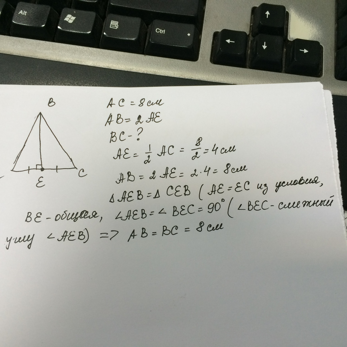 Точка E середина стороны AC треугольника ABC. Точка E соединена с вершиной B отрезком, угол BEA = 90 градусов, AC = 8 см. AB = 2AE. Найдите длину BC.