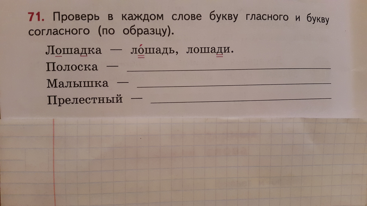 полоска- проверяемые гласные первая о и с-полосы,полосочка.малышка-проверяемые гласные а и ш-мал,малышечка.прелестный-проверяемые гласные е и т- прелесть,это проверочное к сразу двум буквам))