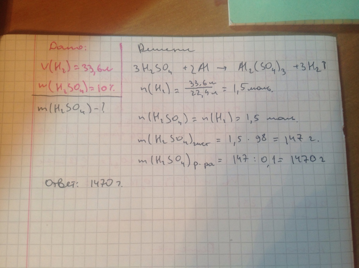 Определить массу 10%-го раствора серной кислоты, если при растворении в ней алюминия выделился водород объемом 33,6 л (н.у)