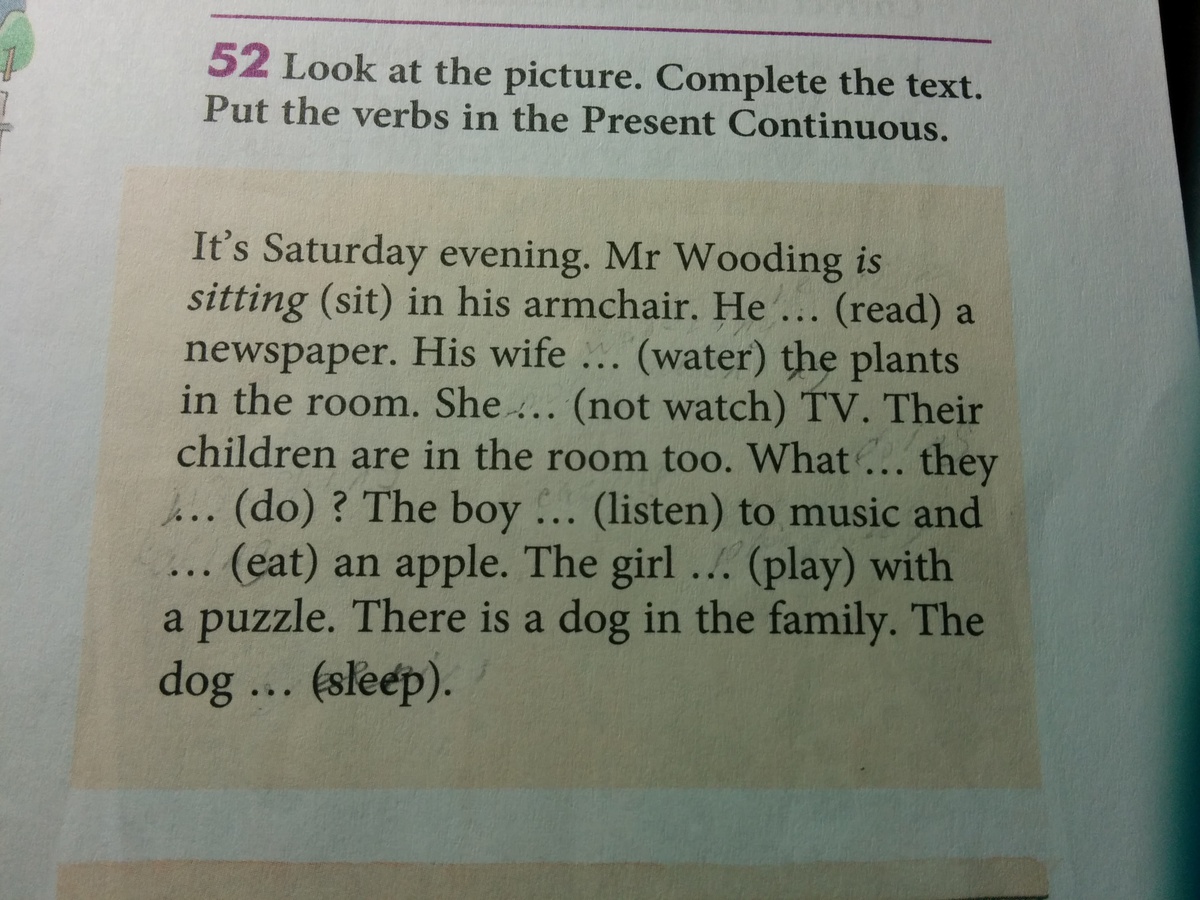 Это суббота вечера.Мистер Вудинг сидит в своем кресле.Он читает газету.Его жена поливает растения в комнате.Она не смотрит телевизор.Их дети в комнате тоже.Что они делают?Мальчик слушает музыку и кушает яблоко.Девочка играет в пазл.Есть собака в семье.Собака спит.