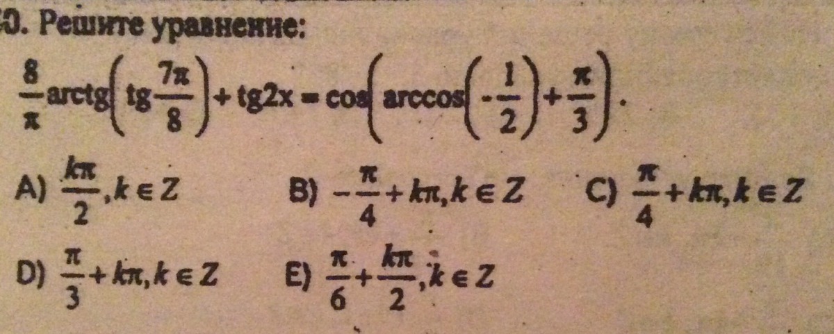 8 / pi * tg(arctg(7pi/8- pi)) + tg 2x = cos(2 pi/3 + pi/3);