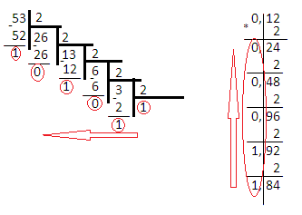 помогите перевести из десятичной системы счисления в двоичную. для дробной части части получить пять знаков 53,12
