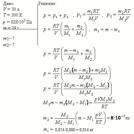 В баллоне емкостью 30 л содержится смесь водорода и гелия при температуре 17 С и давлении 1 МПа. Масса смеси 30 г. Найти (в г) массу водорода и массу гелия.