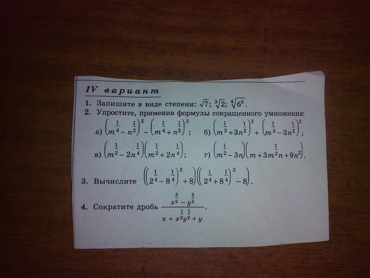 a) (m^1/4-n^1/2)^2-(m^1/4+n^1/2)^2=m^1/4-n^1/2-m^1/4-n^1/2)*(m^1/4-n^1/2+m^1/4+n^1/2)=-2n^1/2+2m^1/4