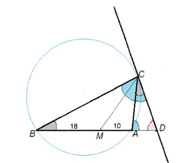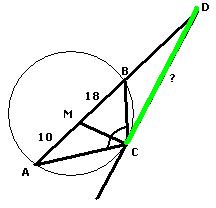 Биссектриса CM треугольника ABC делит сторону AB на отрезки AM=10 и MB=18. Касательная к описанной окружности треугольника ABC, проходящая через точку C, пересекает прямую AB в точке D. Найдите CD.