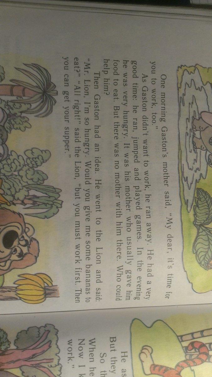 Затем у Гастона появилась идея. Он пошел ко льву и сказал: "Мистер Лев, я так голоден. Не могли бы вы дать мне несколько бананов?" "Хорошо!" сказал Лев, "но сначала ты должен поработать. После этого ты получишь свой ужин".