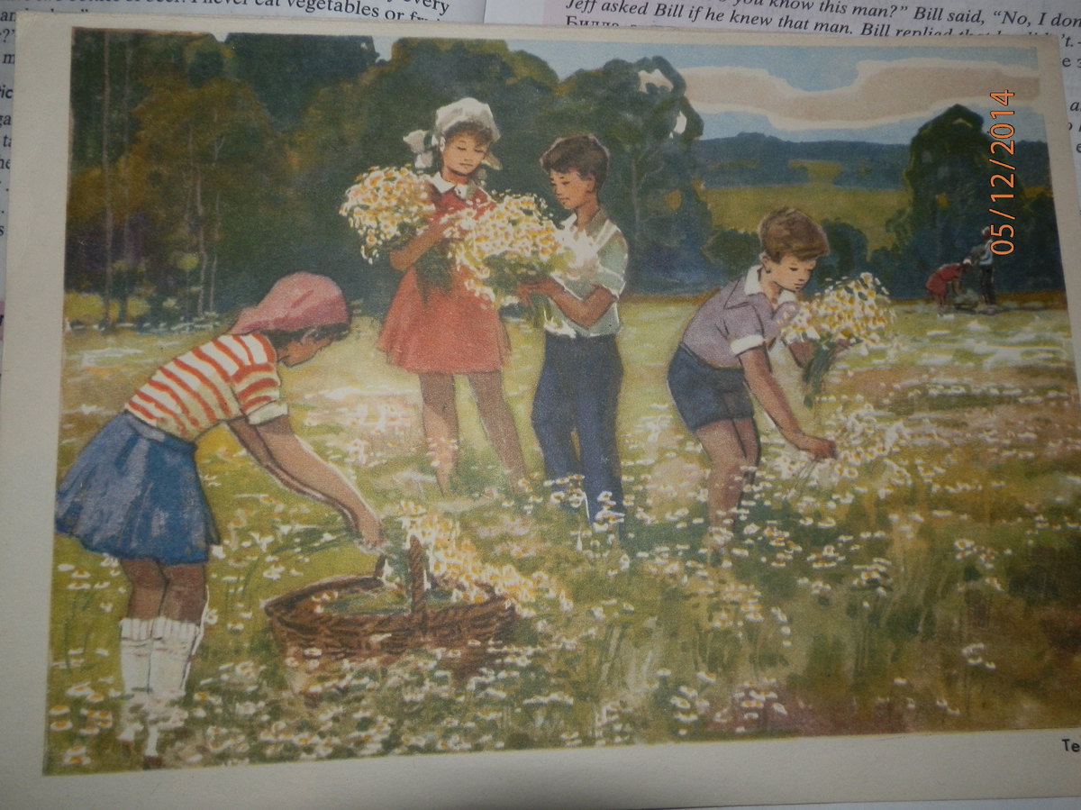 In the picture you can see how the children gather flowers. The weather is sunny.Прости,ну у меня нет времени,добавь меня в друзья и я по позже помогу)))