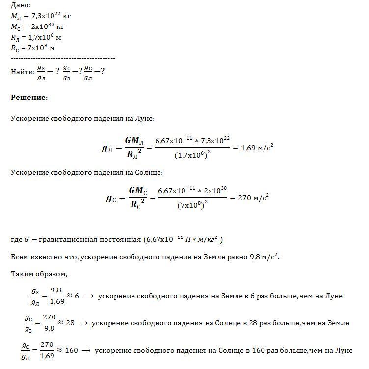 Сравните ускорение свободного падения на поверхности Земли, Луны и Солнца. Массы Луны и Солнца примите равными 7,3 * 10^19 и 2 * 10^27 т , и их радиусы 1,7 * 10^3 и 7 * 10^5 км . Спасибо.