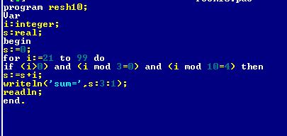 Помогите составить программу в паскале для решения задачи: Найти сумму целых положительных чисел больше 20 и меньших 100, кратным 3 и она заканчивается на 4.