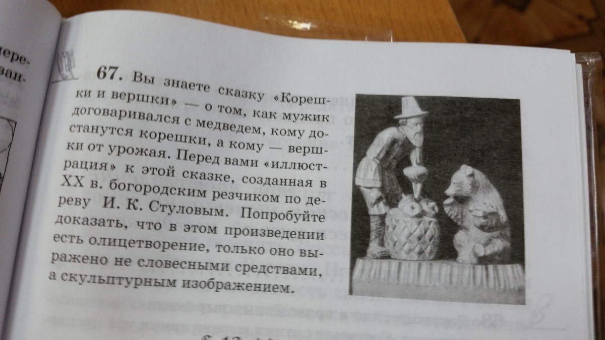 Поза медведя, а именно наклон головы и то, что лапа его поднята к морде говорит о том , что медведь думает над словами мужика , он пытается осмыслить их. В позе мужика , а именно то,что он наклонился к животному, явно прослеживается, что между ними диалог. Они разговаривают, спорят. Это и есть олицетворение. Автору удалось передать живой диалог и оживить величественного медведя.