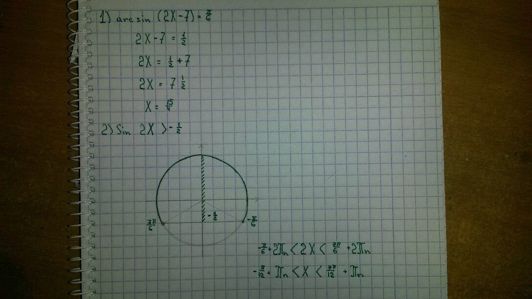 10 класс. Тригонометрия . Решить: 1)arcsin(2x-7)=п/6. 2)sin2x>-1/2. 3)tg x/2 меньше ровно корень 3/3. Заранее огромное спасибо, буду безумно благодарен.
