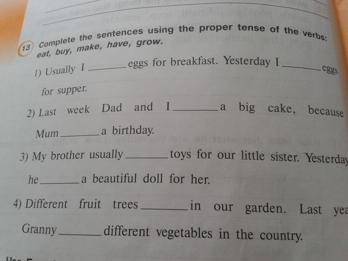 Complete the sentences using the proper tense of the verbs:eat,buy,make,have,grow.
