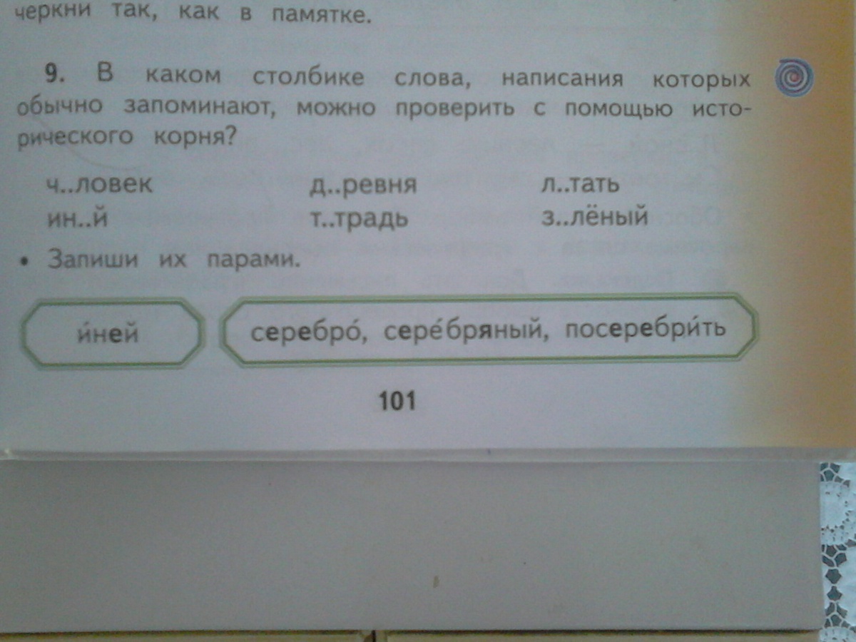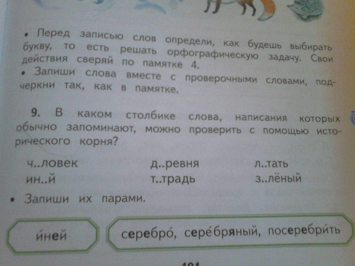 9 задание- Слова, которые обычно запоминают: человек (словарное слово, его нужно запомнить), иней (не проверяется, нужно запомнить), тетрадь (словарное слово, но вообще происходит от греческого слова "тетра" что означает "четыре")