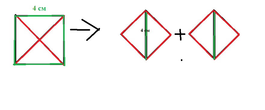 квадрат со стороной 4 см разрезали на четыре равные части и составили из них два одинаковых квадрата. нарисуйте как это сделали. вычисли чему равна площадь полученных маленьких квадратов