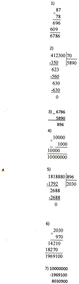 подалуйста!!!! решите пример на листике по столбикам сфотайте и вышлите мне!!!! пожалуйста!!! останусь в долгу. 10.000*1.000-1.818.880:(87*78-412.300:70)*970=??? пожалуйстааа!!! <:(