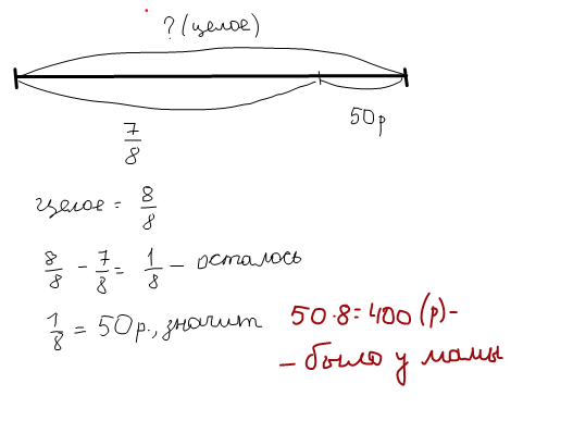 Мама израсходовала семь восьмых своих денег, и у нее осталось 50 р.Сколько денег у нее было сначала