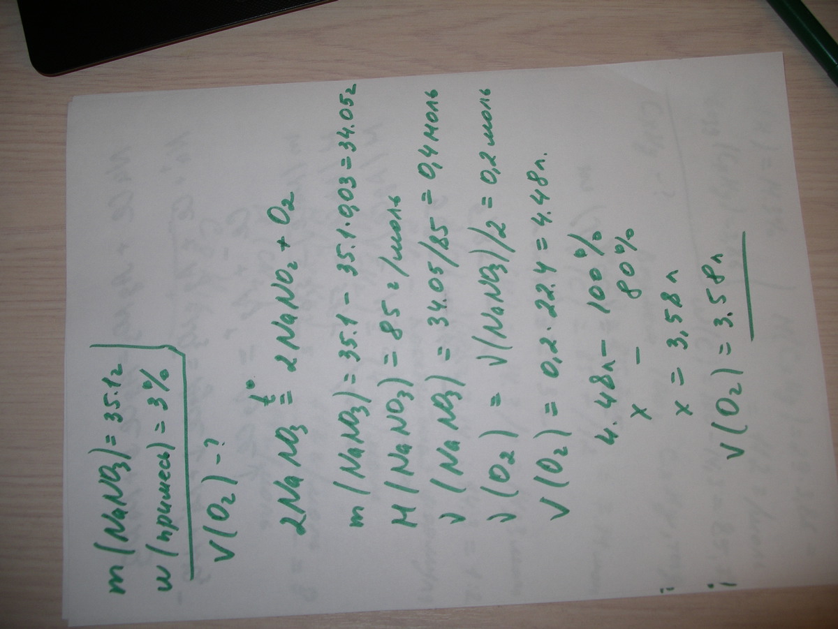 Нагрели 35,1 г нитрата натрия, содержащего 3% примеси хлорида натрия. Вычислите объем выделившегося газа,если его выход составляет 80% от теоретически возможного.