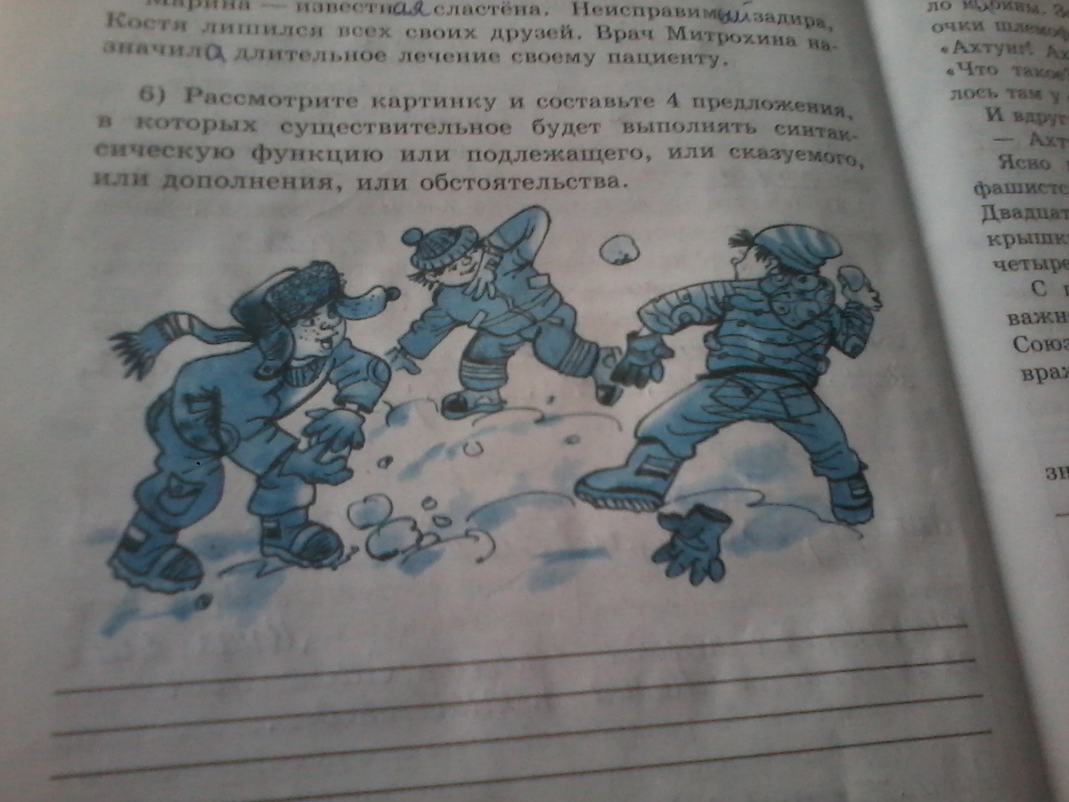Рассматрите картинку и составте 4 предложения, в которых существительное будет выполнять синтаксическую функцию или подлежащего, или сказуемого, или дополнения, или обстоятельства