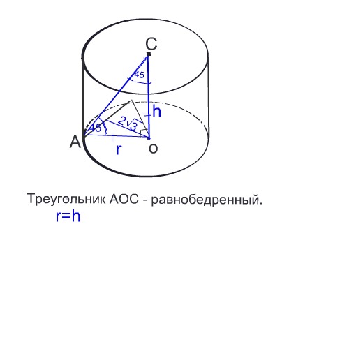 Так как отрезок, соединяющий центр верхнего основания с одним из концов данной хорды образует с осью цилиндра угол 45 градусов, то этим отрезком, радиусом и осью цилиндра ( высотой его) образуется равнобедренный треугольник. следовательно, высота цилиндра равна радиусу его оснований.