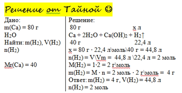 Рассчитайте объем, количество вещества и массу водорода, полученного при взаимодействии 80г кальция с водой