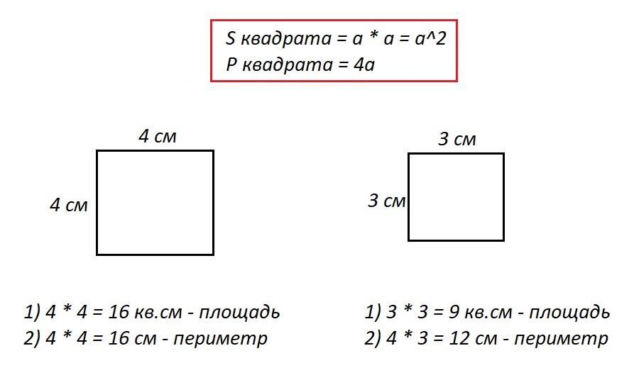 незнайка начертил квадрат со стороной 4 см. Уменьши сторону на 1 см. Начерти полученный квадрат. Найди площадь и периметр этих квадратов.
