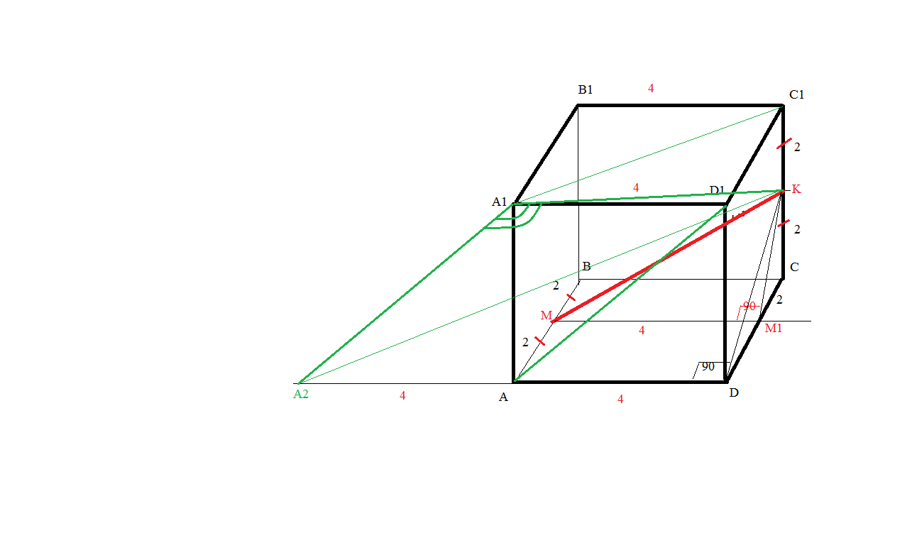 Дан куб АВСDA1B1C1D1 с ребром а=4 см. Точки М и К – середины ребер АВ и СС1 соответственно. Найдите: