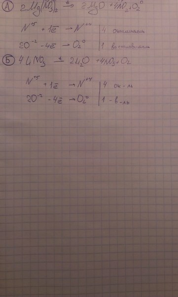 Напишите уравнения реакций термического разложение нитратов: а) магния б)лития. Составьте схемы электронного баланса.