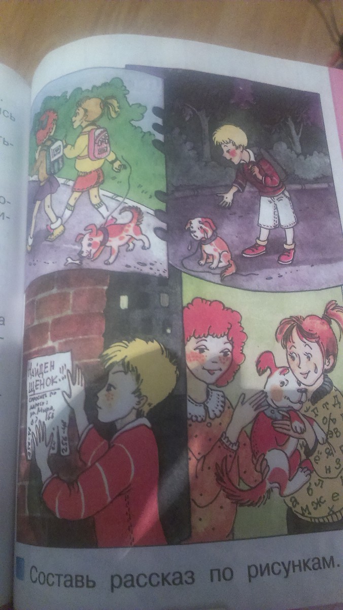 Однажды девочка гуляла с собакой.Когда девочка отвлеклась,собака вырвалась из поводка и убежала.Когда мальчик возвращался домой он увидел этого щенка.И он решил написать объявление.Когда та самая девочка проходила мимо этого объявления,она остановилась, прочитала его и позвонила по номеру,который был ьам указан.Спустя сутки мальчик позвонил ей в квартиру и вернул щенка.Всё закончилось хорошо.