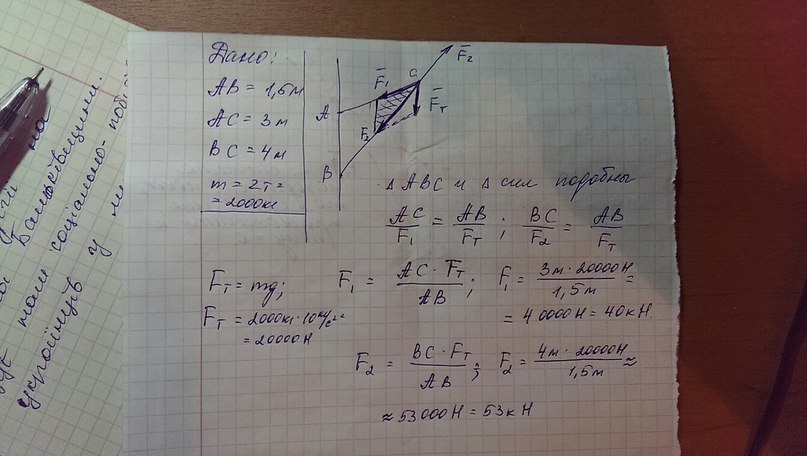 Стенной кран имеет длину подкоса ВС = 4 м, длину тяги АС = 3 м и расстояние АВ = 1,5 м. Определите силы, действующие на тягу и подкос, если масса поднимаемого груза m= 2 т.