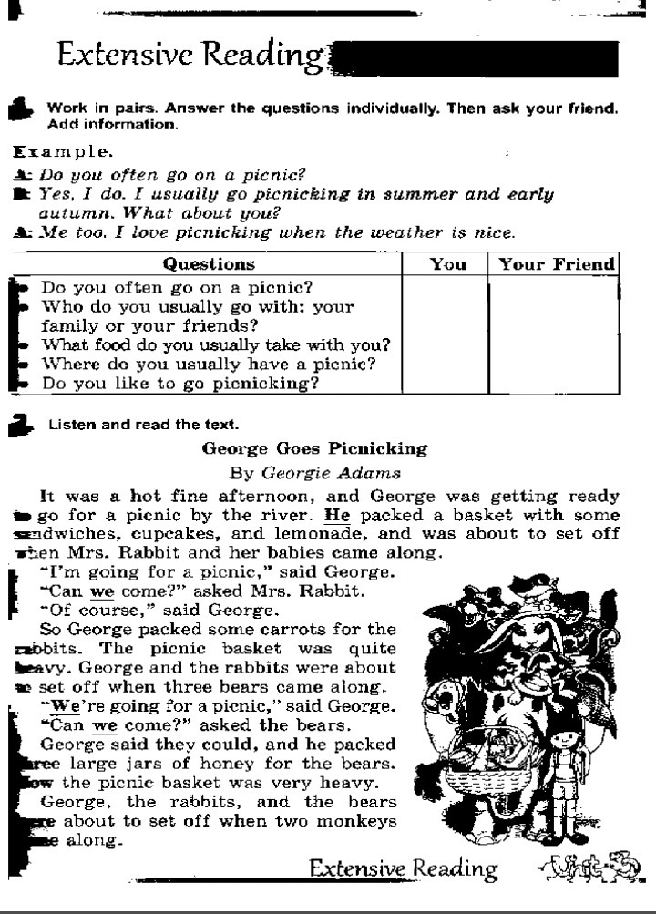 Это был хороший жаркий день и Джордж готовился отправиться на пикник к реке. Он собрал в корзину для пикника несколько сэндвичей, кексов и немного лимонада, он уже приготовился отправиться в путь, когда Миссис Рэббит и ее дети пришли.